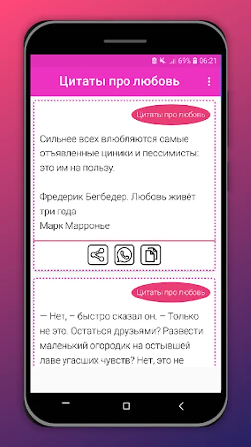 Our collection is constantly updated with new quotes, wise aphorisms and funny statuses of love. By installing this application, you can more accurately convey your thoughts and experiences. Make your loved one listen carefully to your words.