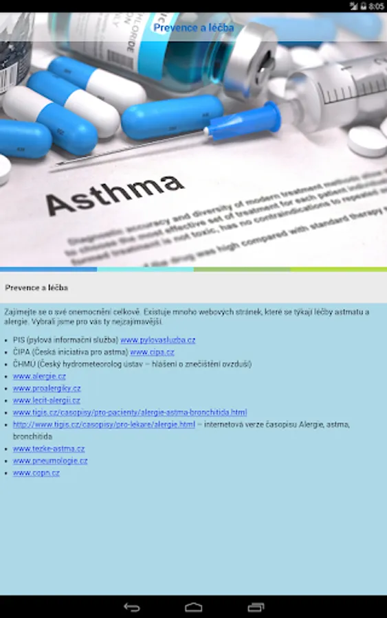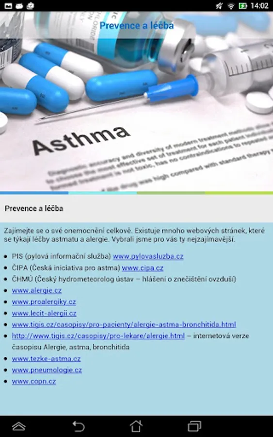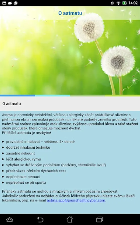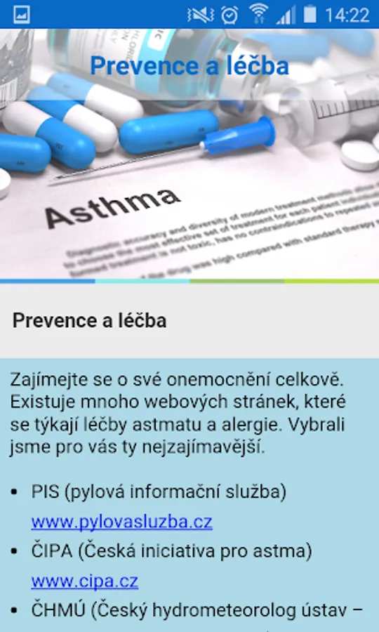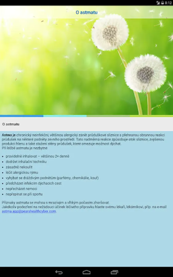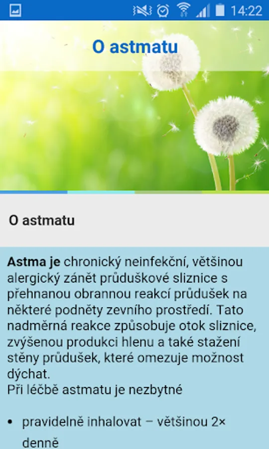 Mobile Application Info Asthma is intended for patients with asthma. Application delivers a comprehensive overview of important information, links, and above all it is a reminder devices, whether standard or concessional benefits and physician visits. By applying the patient is familiar with the statistics of the use of benefits and also knows exactly how many doses remain in the inhaler him.