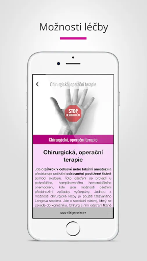 Hemorrhoids mobile application is intended for patients with hemoroidálním disease that is estimated to occur in up to 40% of the population. Applications provides a comprehensive overview of important information about the causes, symptoms and options for effective treatment of this frequent disease of the rectum.