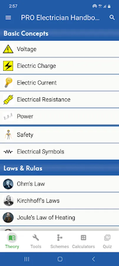Electrician Handbook Pro covers everything from electrical symbols and basic theory to wiring diagrams, calculators, and tools reference. Whether you're preparing for an exam, solving on-site problems, or completing home electrical tasks, this app delivers core concepts in a simplified and accessible format.