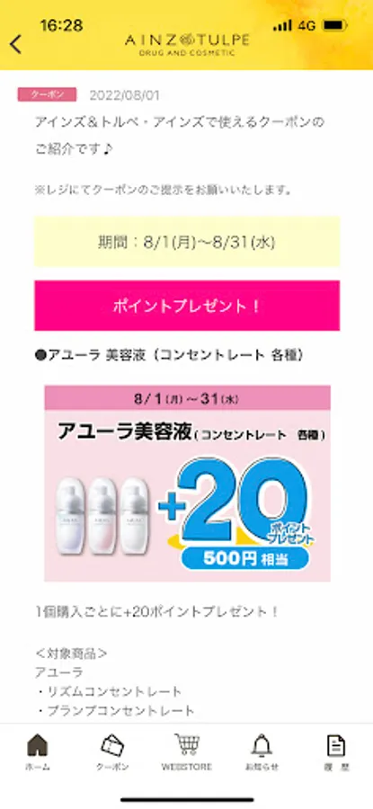 For every 500 yen (excluding tax) you shop at Ains & Torpe Ains nationwide, you will earn 1 point (equivalent to 25 yen) and points equivalent to a maximum of 10% reduction.