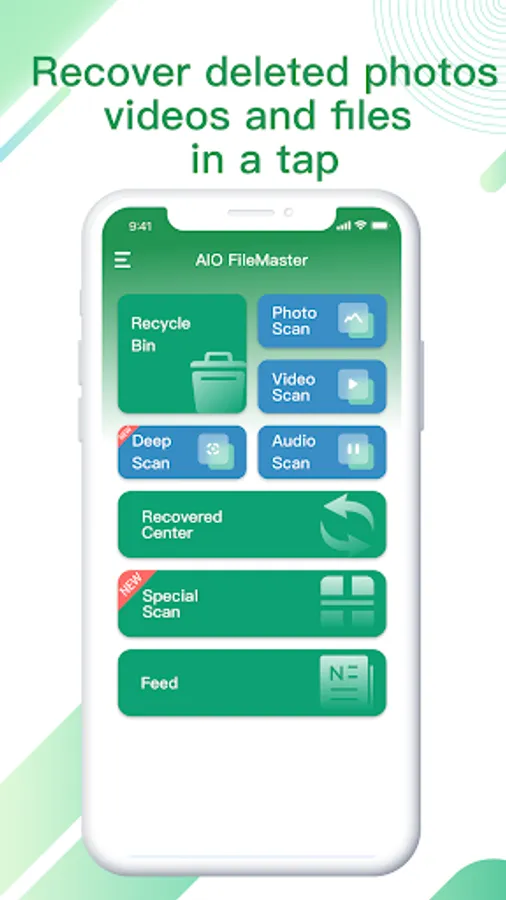 Throughout its history, AIO FileMaster became a default app for data recovery. AIO FileMaster is so rich in features that it's got a whole set of nicknames from our amazing users: deleted video recovery app, recycle bin, photo backup app, deleted pictures recovery app, recently deleted photo recovery, or file recovery tool. Regardless of what you call it, once you install AIO FileMaster you receive a smart tool, which will help protect your valuable files, backup and restore photos, recover recently deleted videos or any other data!