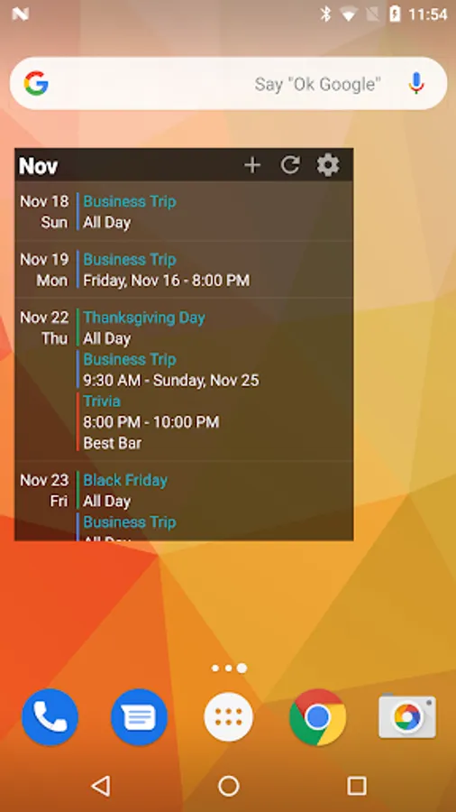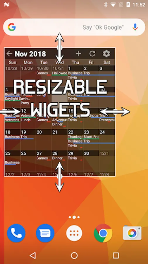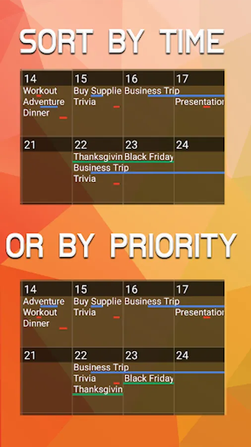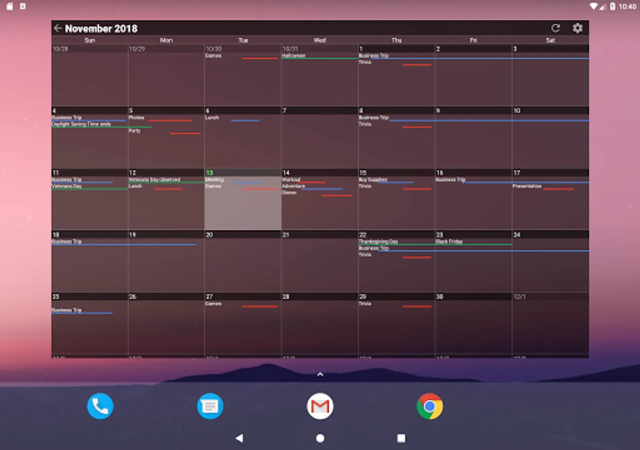 This calendar widget displays your schedule in a big picture style of view right on your home screen, allowing you to see your schedule at a glance. As a better kind of planner, events are not displayed only as dots, but with time lines that start and end according to the times that your events start and end. No need to tap on a day to get details, it's all displayed right on the calendar! An agenda widget is also included that lists events for upcoming dates.