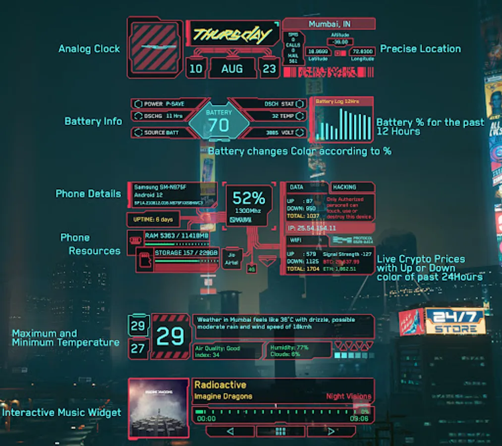 πΊοΈ Location Integration: Let your home screen adapt to your surroundings with real-time location information, merging seamlessly with the urban tapestry of the Cyberpunk universe.