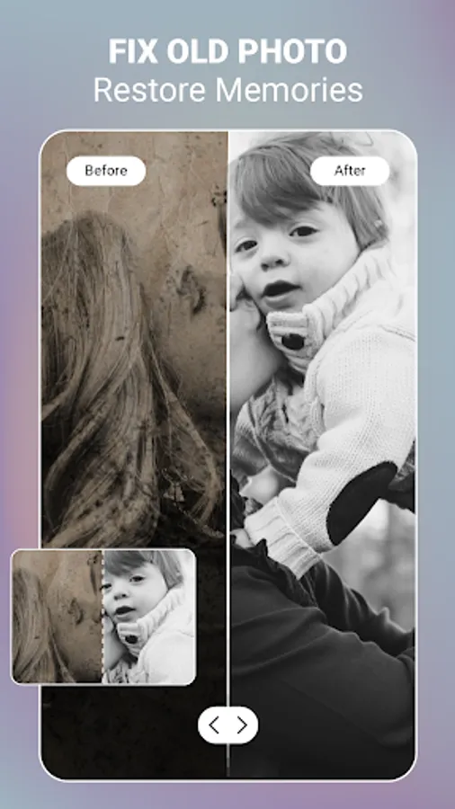 Let's try Aibi - professional app to clear photo, restore and enhance photo quality. With modern and advanced AI technology, the picture editing app helps you to turn old and broken photos into sharp and high photo restoration. Thanks to photo AI app, your old memories become more vivid and clear.