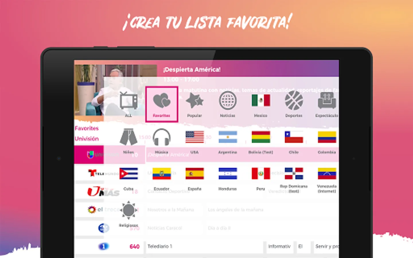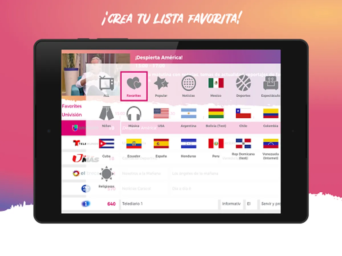 • You can Browse a growing selection of channels that are all displayed in categories, like Argentina, Bolivia, Chile, Colombia, Cuba, Ecuador, Spain, Mexico, Peru, Popular US digital TV channels in Spanish, News, Entertainment, Kids, Cinema, Music, Sports, Religious. All channels are in Spanish language.
