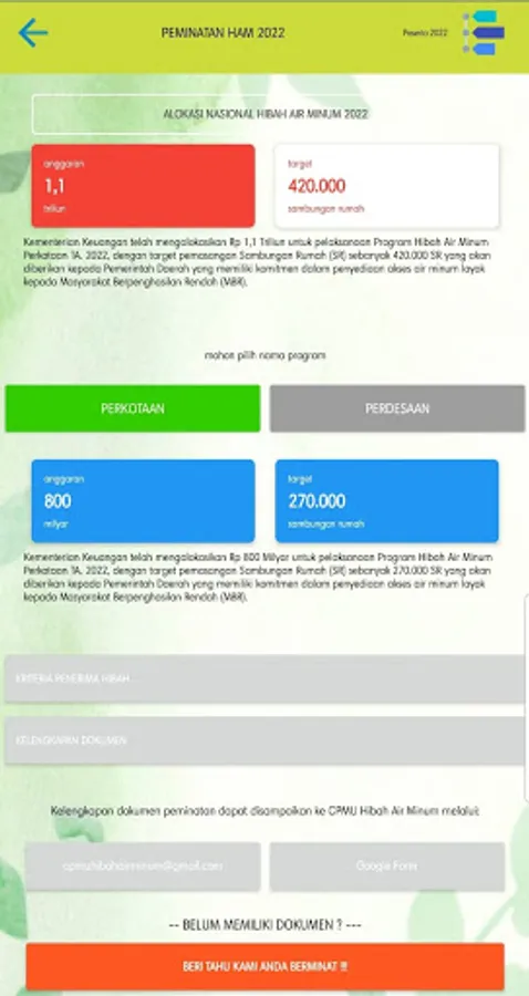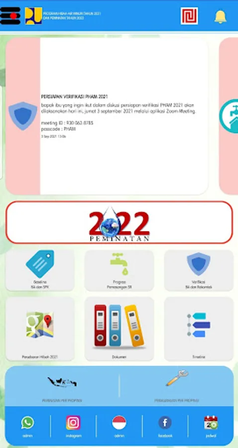 This application contains a collection of databases for the 2021 State Budget Water Hibah Program and 2022 specialization. Grant participants can control the documents that have been submitted to the CPMU/Ministry of Finance as well as monitor the progress of the baseline survey implementation, installation and verification, minutes of events and also contains a collection of guidelines and materials related to the Water Hibah Program.