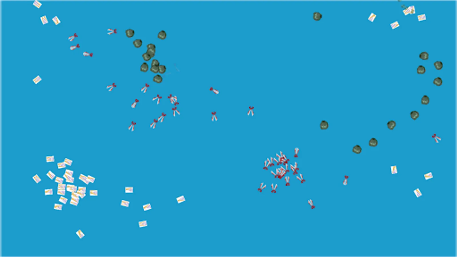 Sandbox game where you put the creatures into the arena and spectate at their behavior. The first version has the creatures who look like living Rock, Paper and Scissors, and behave accordingly.