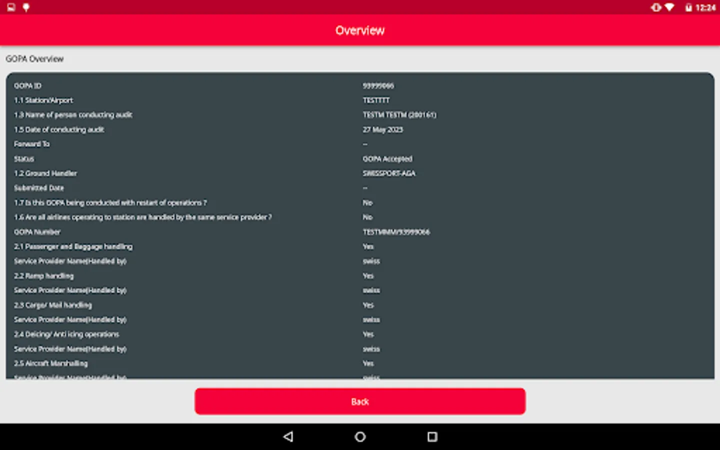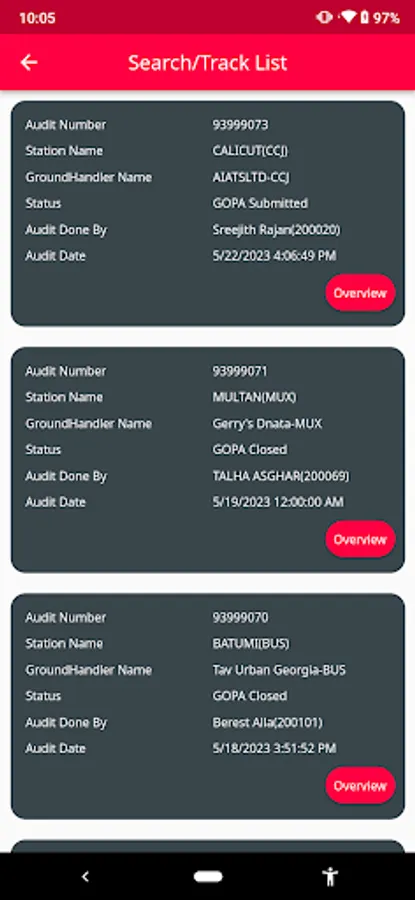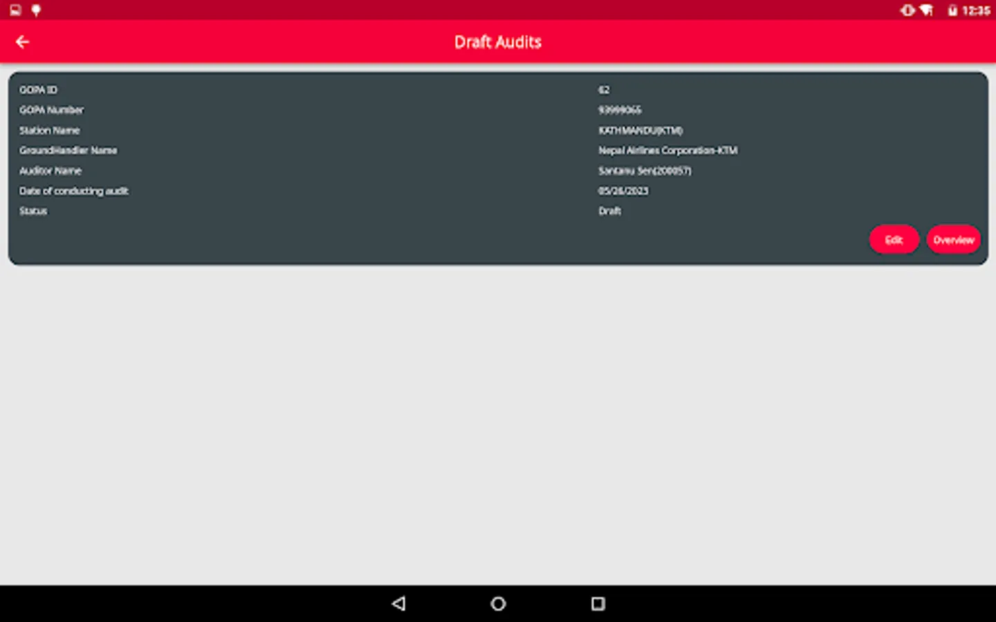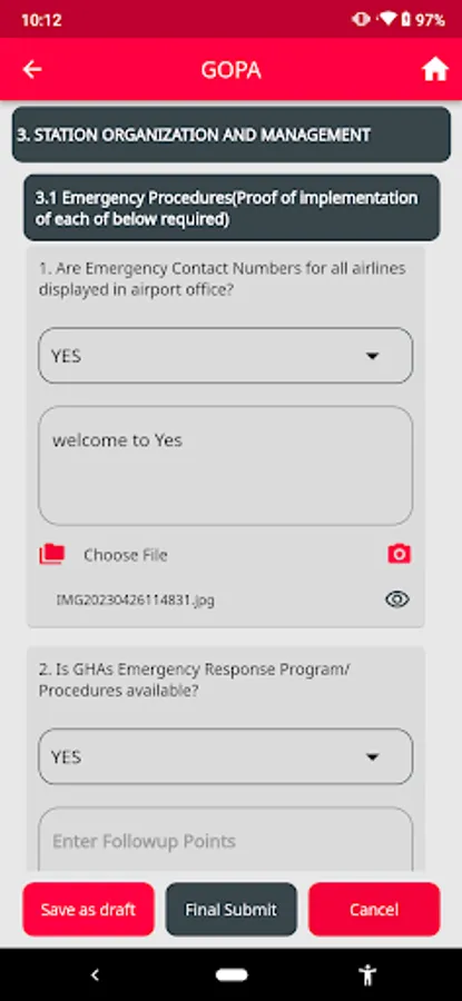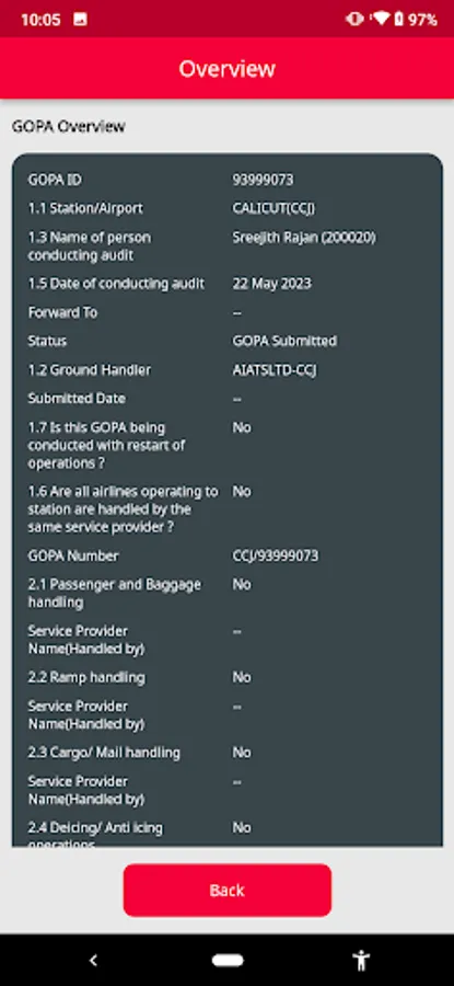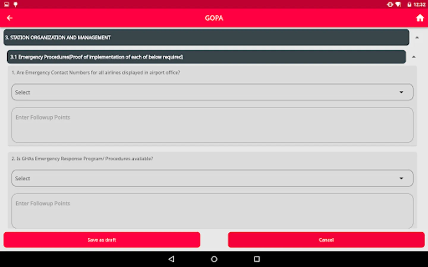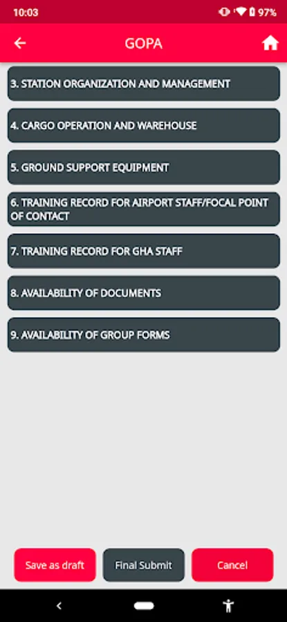 This mobile application facilitates the auditing process for airport managers (APMs) or regional managers (RGMs) by providing access to a comprehensive checklist for compliance assessment. The app allows users to attach images as evidence for each checklist item. Furthermore, it offers offline functionality, enabling data storage on the device, with the option to synchronize it with the remote database at a later time.