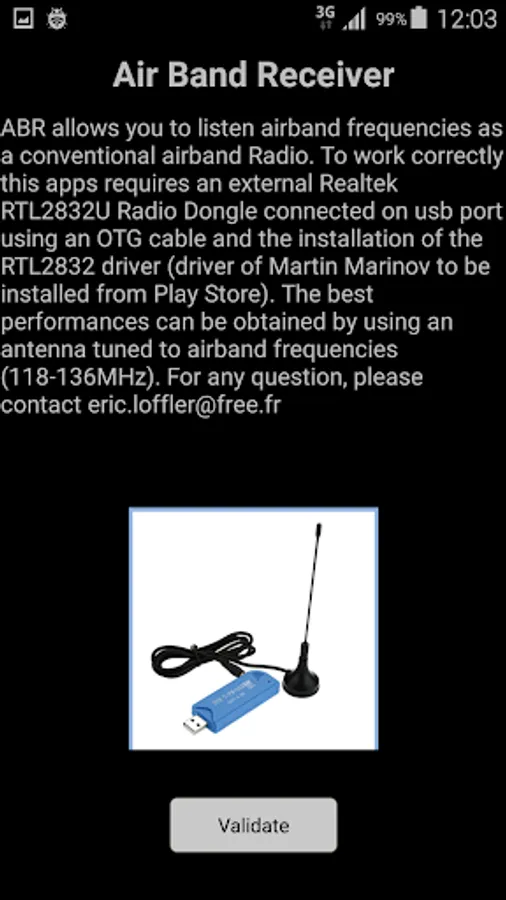 ABR allows you to listen airband frequencies as a conventional airband Radio. To work correctly this apps requires an external Realtek RTL2832U Radio Dongle connected on usb port using an OTG cable and the installation of the RTL2832 driver (driver of Martin Marinov to be installed from Play Store). The best performances can be obtained by using an antenna tuned to airband frequencies (118-136MHz).