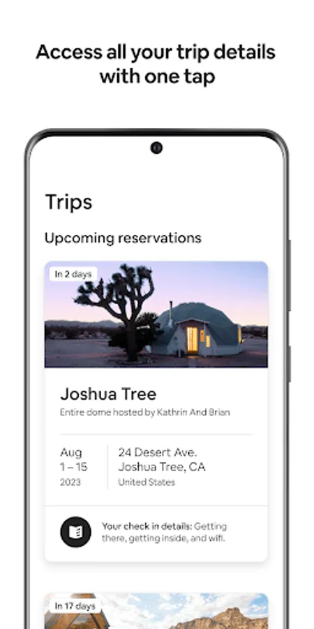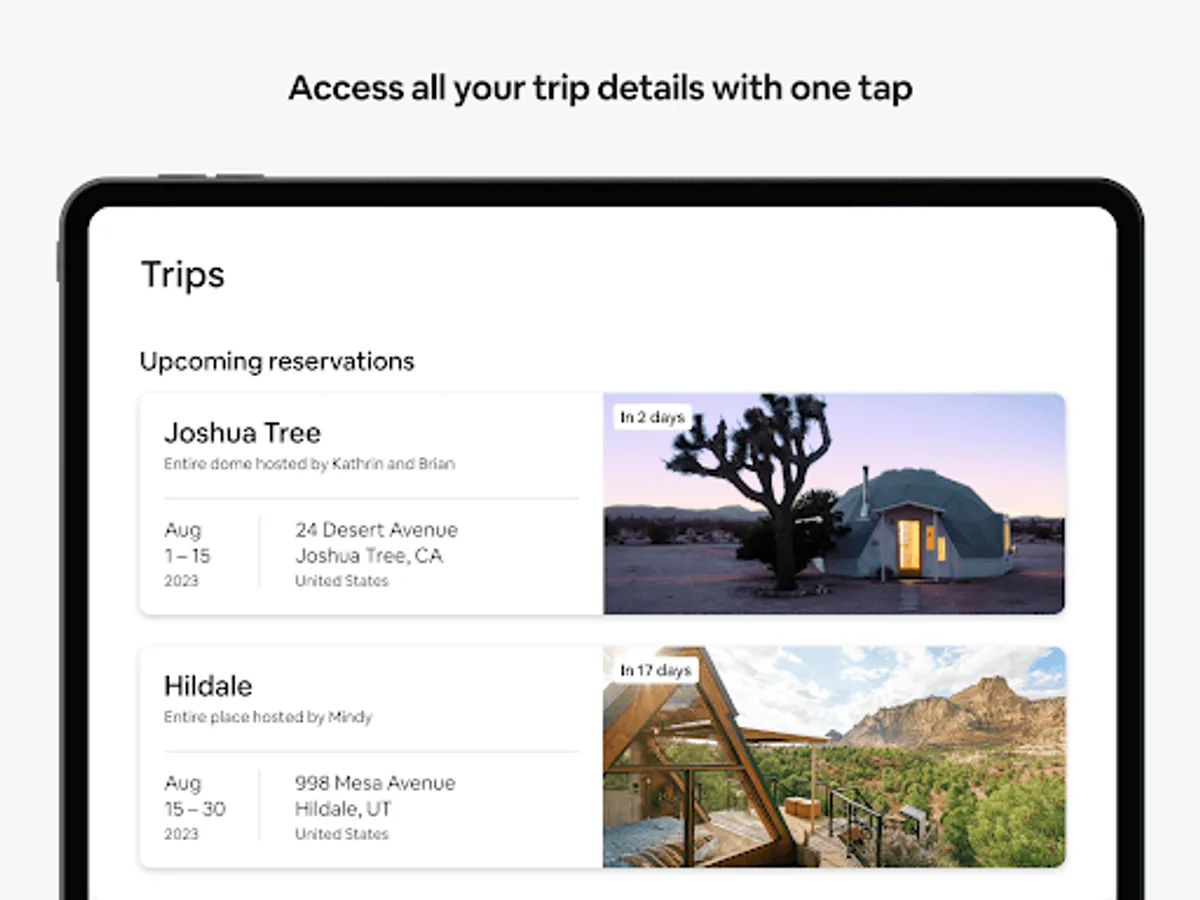 The Airbnb app keeps all your essential trip info in one convenient place, so you can quickly revisit or share your travel details with others. You’re also able to chat with your Host and receive up-to-the-minute booking updates, making it easier to get there, get inside, and get connected to wifi.