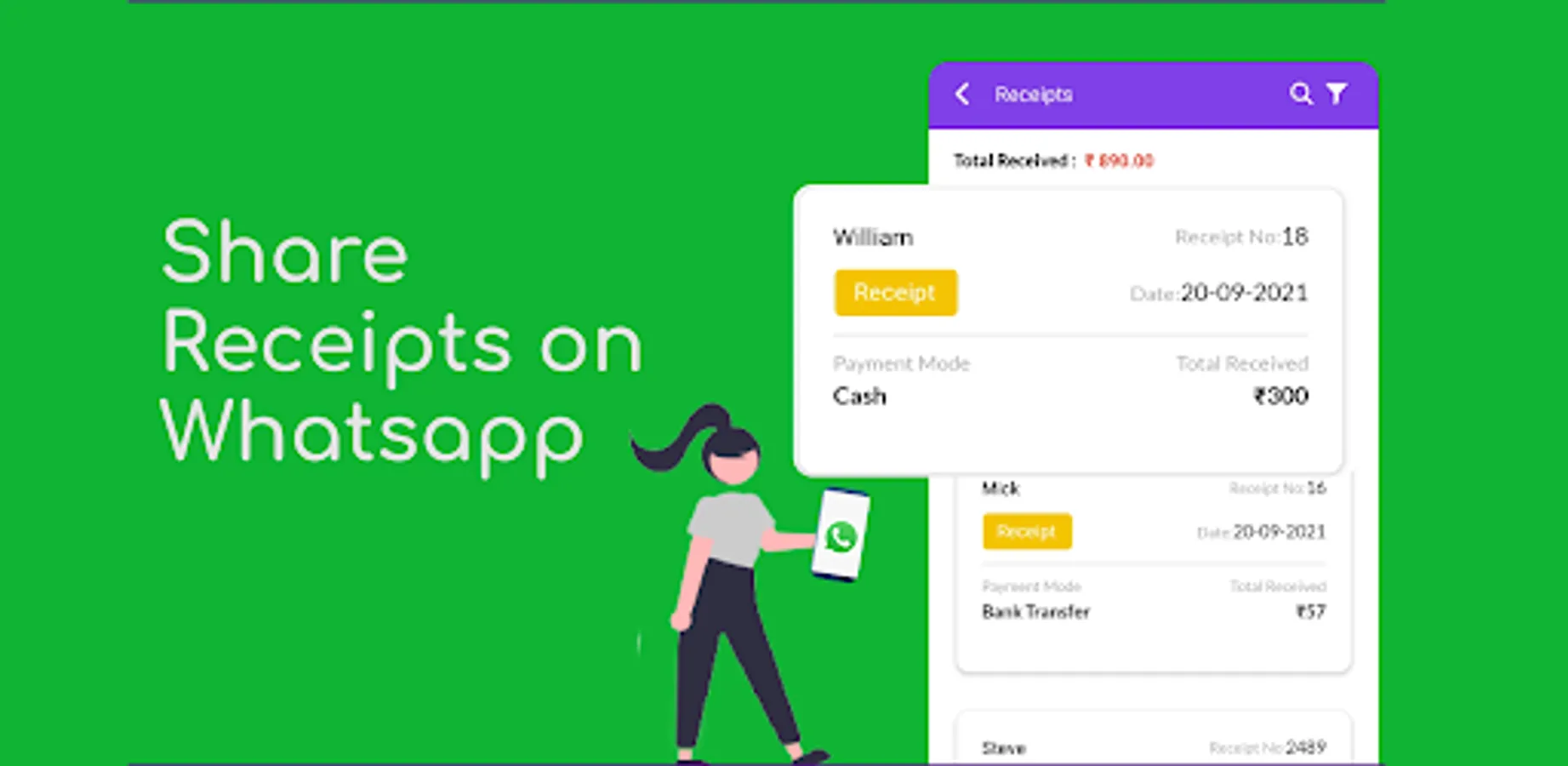 With this receipts maker, easily add payment receipts and share receipts as SMS or payment receipt PDF. You can share payment receipts on WhatsApp or over email.
