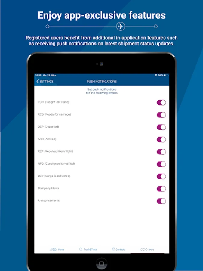 - e-Mail & push notifications on tracked AWBs, news and announcements