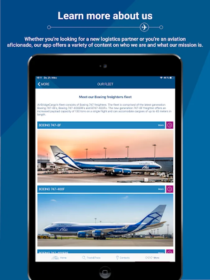 The ABC app provides easy access to detailed information on our products and services, fleet and airplane specifications, network and much more.