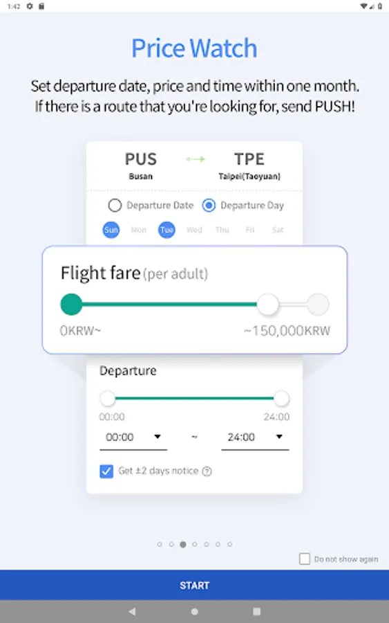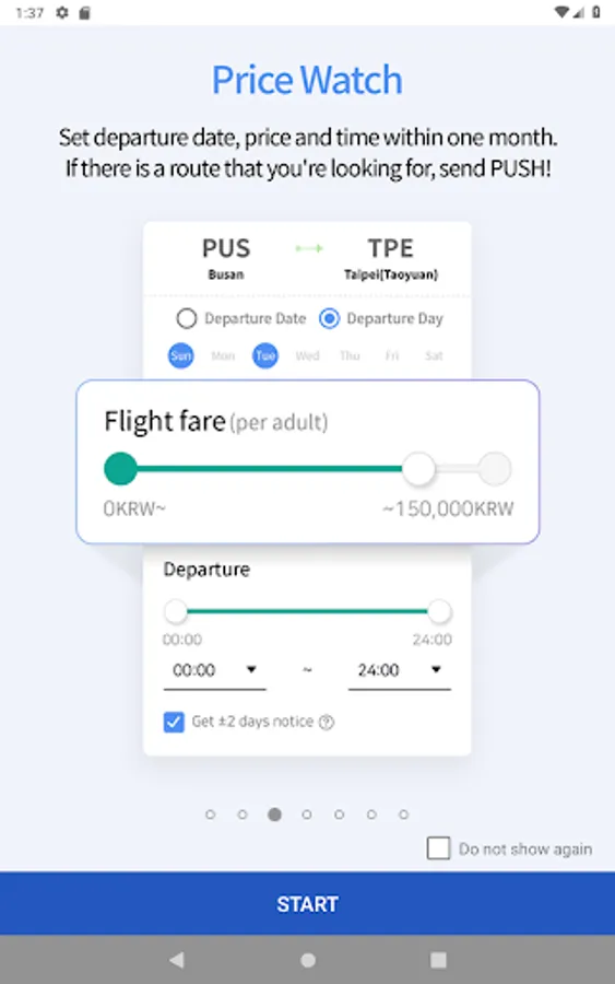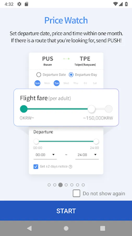 - Price Watch: Receive PUSH notification when the conditions (destination, date, price, time) are fit.