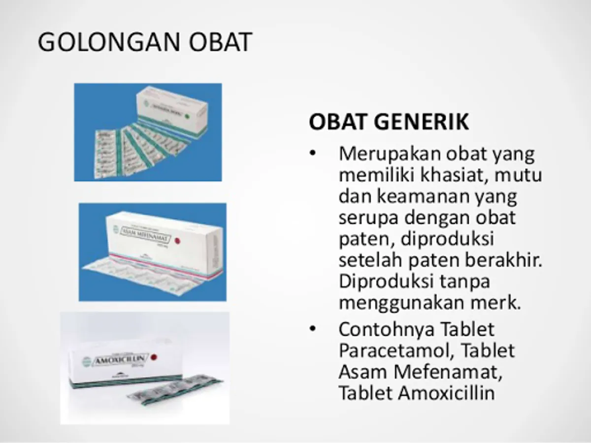 Consumed by Children or Adults and Forms of Medicines and List of Indonesian Drug Names and Their Functions, then an explanation of Generic Drugs is the name of the same drug as the active active substance it contains, according to the official name of the International Non Propietary Names which has been stipulated in the Indonesian Pharmacopoeia.