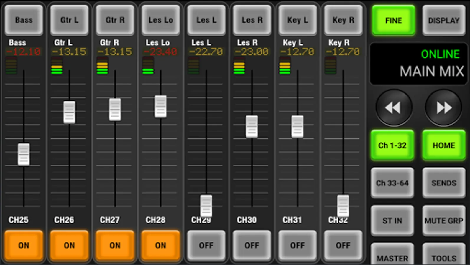 Sends on Faders mode allows you to adjust any Channel Send for a single Mix/Matrix, or open the Channel View and adjust any Mix/Matrix for a single channel. Perfect for fast sound checks.