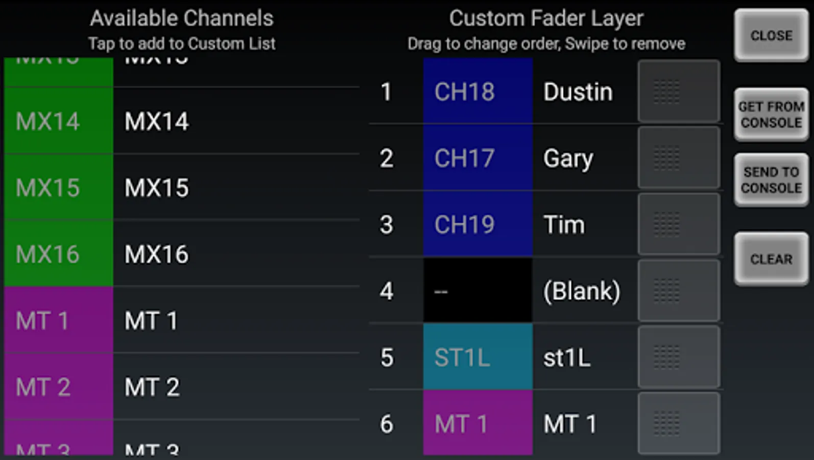 Custom Fader Layer allows you to assemble any channels in any order including duplicates and blank spaces, with draggable re-ordering. You can even copy the Custom Layer to/from the console.