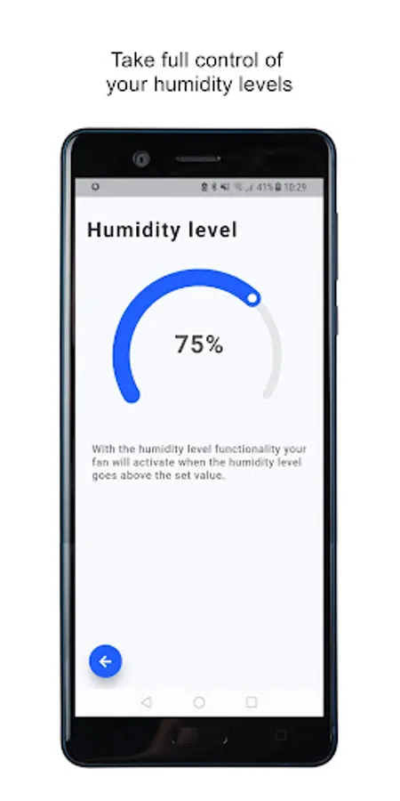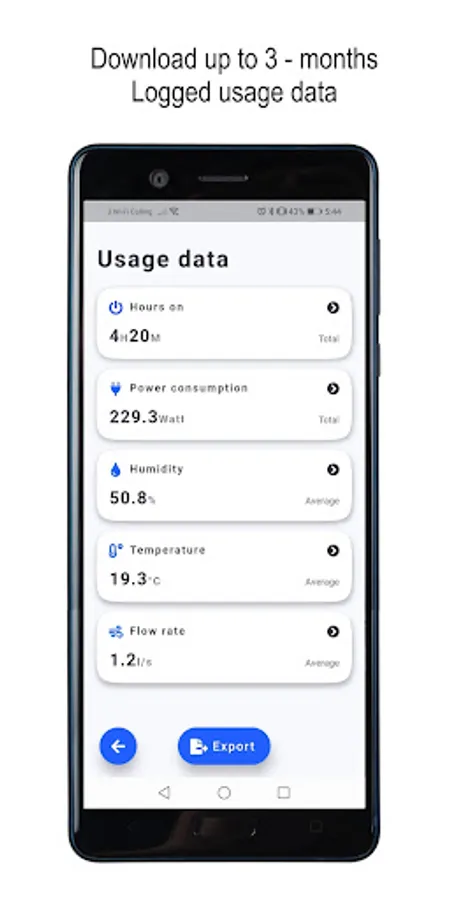 - Live room health graph, displaying current humidity levels and rolling log of data usage, tracking the operating hours for the fan.