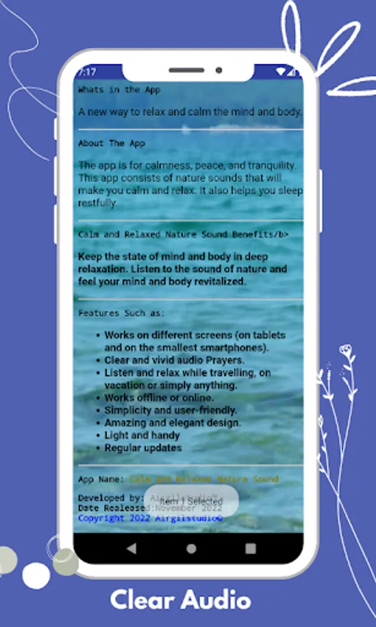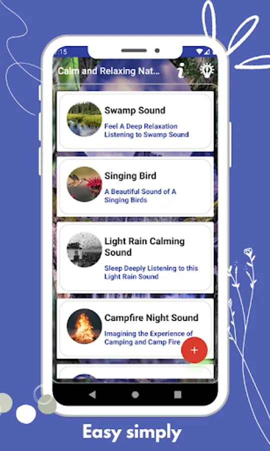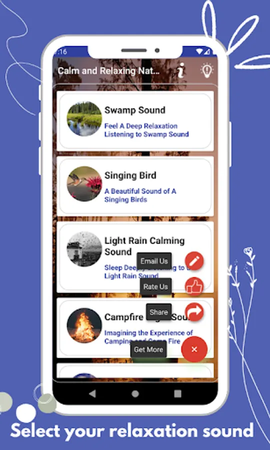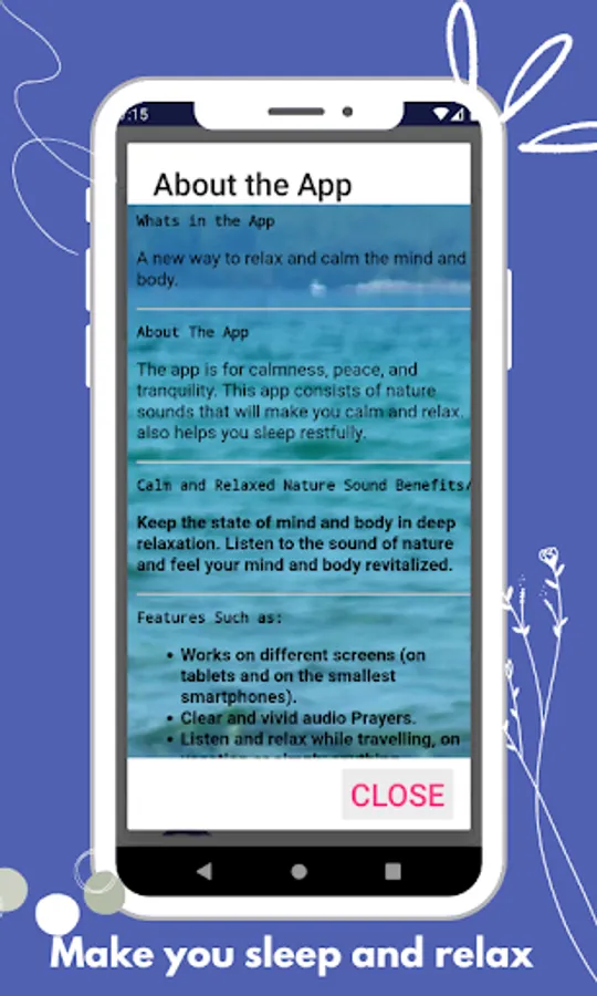The app is for calmness, peace, and tranquility. This app consists of nature sounds that will make you calm and relaxed. It also helps you sleep restfully.