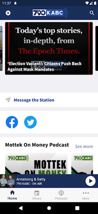 Never be without your favorite radio station. 790 KABC-AM is proud to present our OFFICIAL radio app. Listen to us at work, home or on the road. Install our app and get instant access to our unique content, features and more!  - New design and interface  - See current playing show, latest podcast episodes and up to date station and local news on a single screen  - Access all your favorite podcast shows on demand. Listen live (less storage requirement) or download and listen when offline  - Get notifications and single click access to any station promotions or contests - View station’s YouTube channel without searching or leaving the app (when available)  - Wake up to your favorite station with our alarm clock. Record a personal reminder to play before waking to the station. - Fall asleep while listening to your favorite station - Access station's weekly show schedules so you don’t miss a thing - Real-time weather for where you are - Share our app via Facebook, Twitter, and e-mail - Car Mode provides simple audio controls so you can listen while on the road