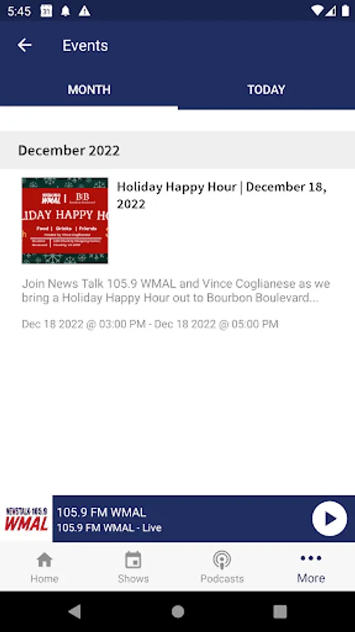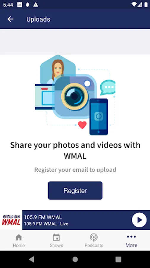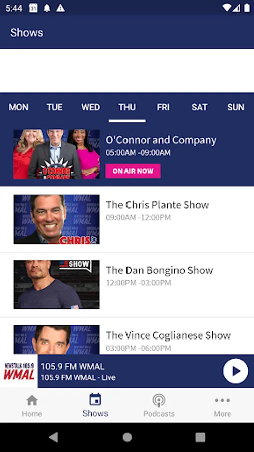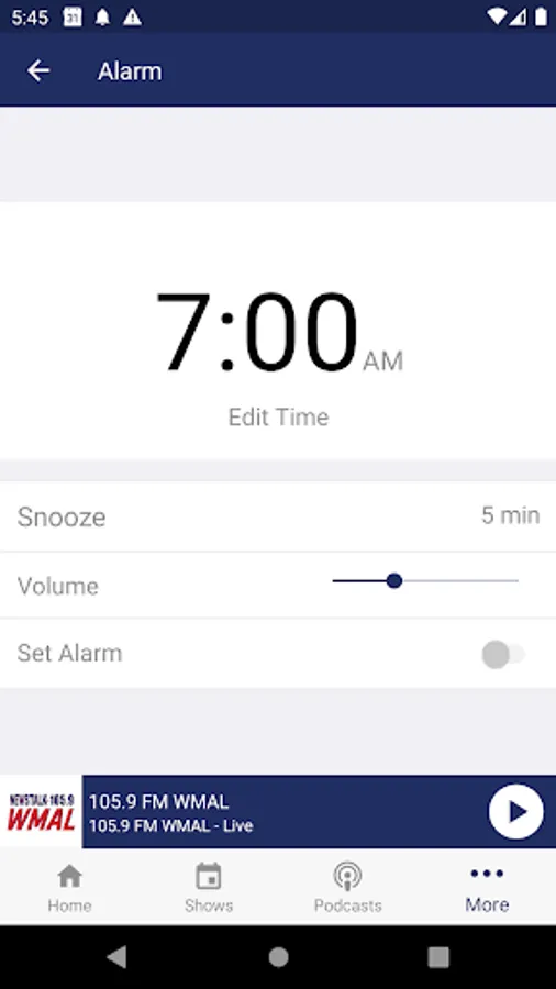 Never be without your favorite radio station. WMAL is proud to present our OFFICIAL radio app. Listen to us at work, home or on the road. Install our app and get instant access to our unique content, features and more! - New design and interface - See current playing show, latest podcast episodes and up to date station and local news on a single screen - Access all your favorite podcast shows on demand. Listen live (less storage requirement) or download and listen when offline - Get notifications and single click access to any station promotions or contests - View station’s YouTube channel without searching or leaving the app (when available) - Wake up to your favorite station with our alarm clock. Record a personal reminder to play before waking to the station. - Fall asleep while listening to your favorite station - Access station's weekly show schedules so you don’t miss a thing - Real-time weather for where you are - Share our app via Facebook, Twitter, and e-mail - Car Mode provides simple audio controls so you can listen while on the road