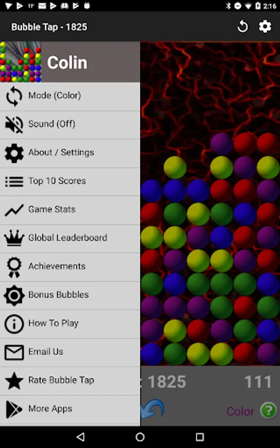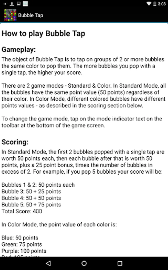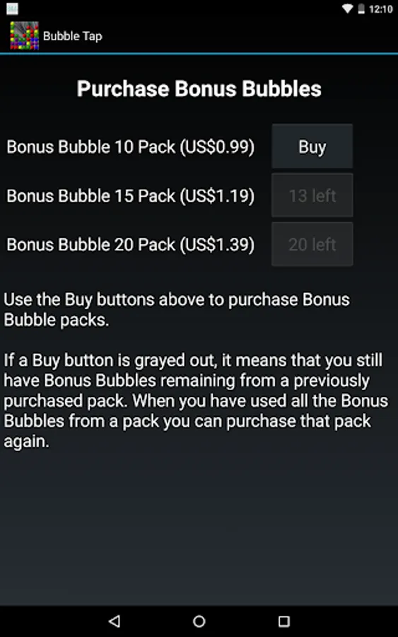 Play either Standard, Color or Challenge mode & use the Bonus Bubble to get you out of a sticky situation. Every 10 games you play earns you a new Bonus Bubble or you can buy packs of 10, 15 or 20 Bonus Bubbles through in-app purchasing.