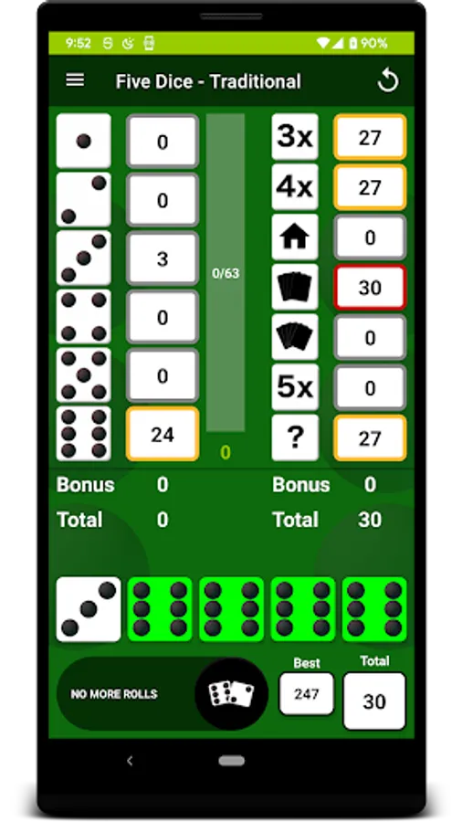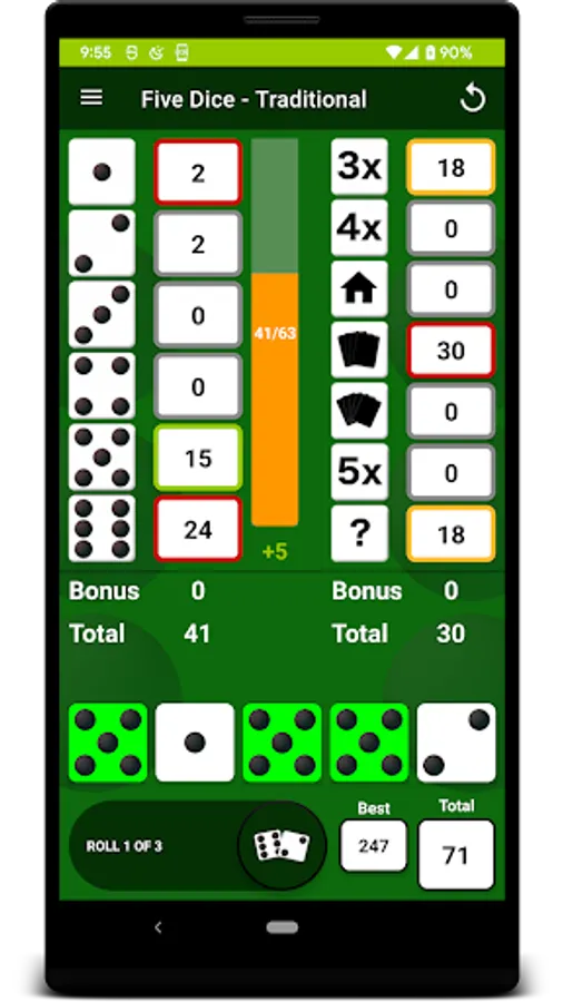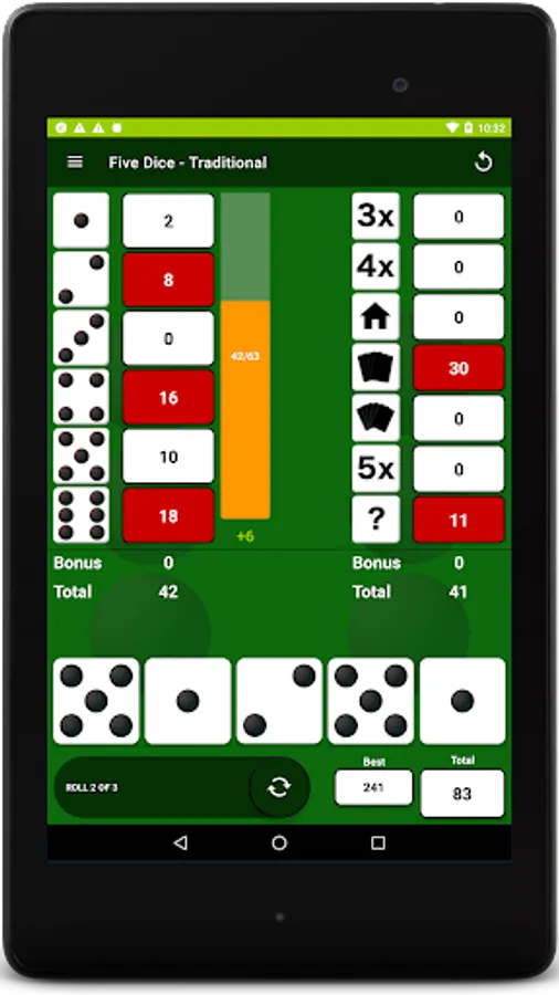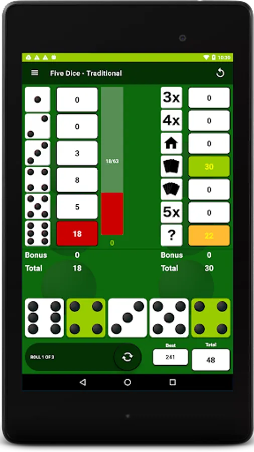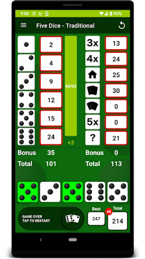 After each roll, all valid scores are highlighted in yellow so you can quickly decide where to apply the results. Where you place the score from each roll is up to you. There are thirteen turns of 3 rolls each per game. After each roll you can choose which dice to keep by touching them, then the remainder will be included in the next roll. At the end of the 3 rolls, you must assign the score before you can move on to the next turn. The first Five Dice is worth 50 points and each subsequent Five Dice will be rewarded with a 100 point bonus. Score 63 or greater on the left side of the score card & get a 35 point bonus.