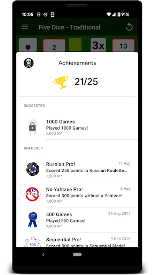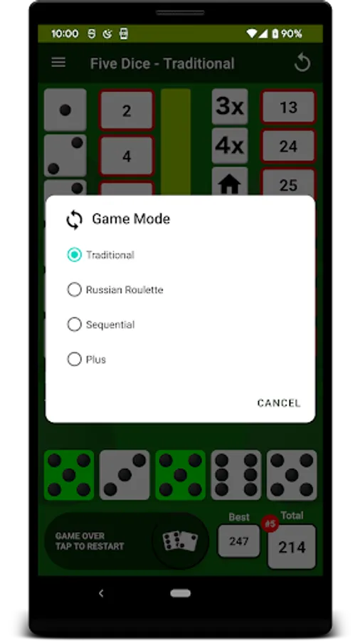 Traditional mode follows the rules of YAHTZEE very closely. Each turn allows up to 3 rolls & there are 13 turns in a game. Tap on the dice you want to keep after each roll & get maximum points by rolling at least 3 of a kind in each of the left scoring categories. If you score at least 63 points on the left, you get a 35 point bonus. Score in 3 of a Kind, 4 of a Kind, Full House, Small Straight, Large Straight, Five Dice & Chance on the right. Score 50 points for your first Five Dice (5 in a row) & a 100 point bonus for every Five Dice after that. Traditional mode has its own leaderboard.