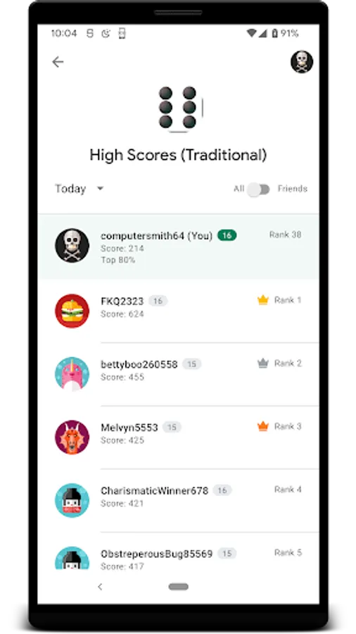 - Top 10 on-device high scores list