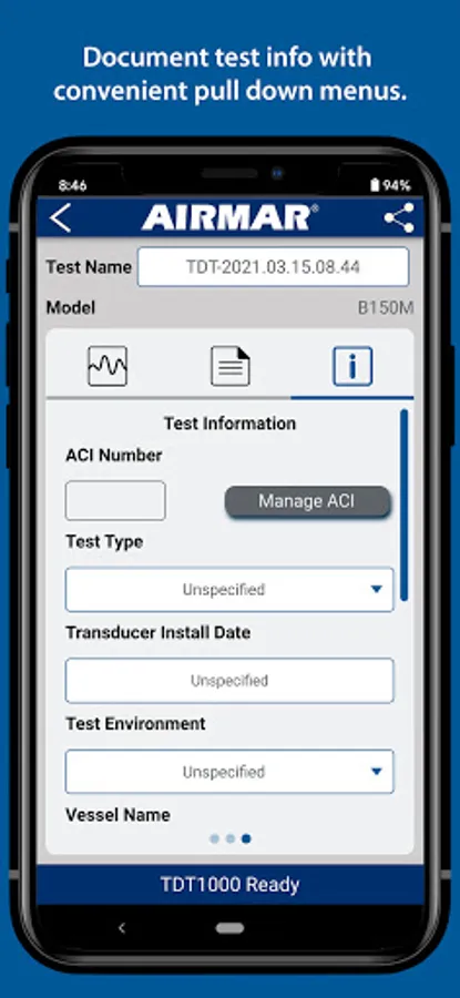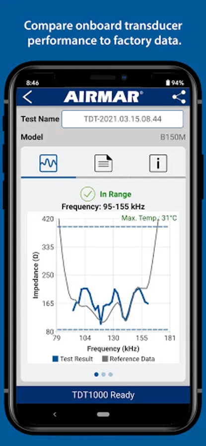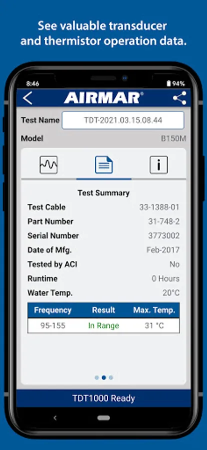 The TDT1000 Transducer Diagnostic Tester compares the transducer onboard your vessel to its original specifications when it left the Airmar factory. Simply install the SensorCheck™ app on your Bluetooth LE-enabled smart device, connect to the TDT1000 and get started! Accurately test both traditional and CHIRP-ready transducers that operate at frequencies ranging from 10 kHz to 500 kHz. With CHIRP-ready units and any traditional units over 1kW and above, the TDT1000 will automatically read Xducer ID® features such as transducer model, frequency, part number and serial number. When the test is complete, custom reports are automatically generated and can be emailed directly to the boat owner or even an Airmar technician.