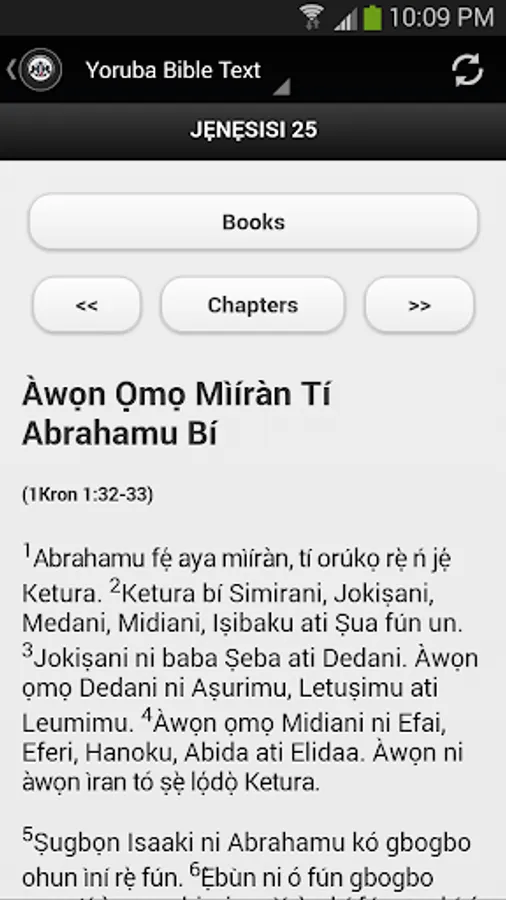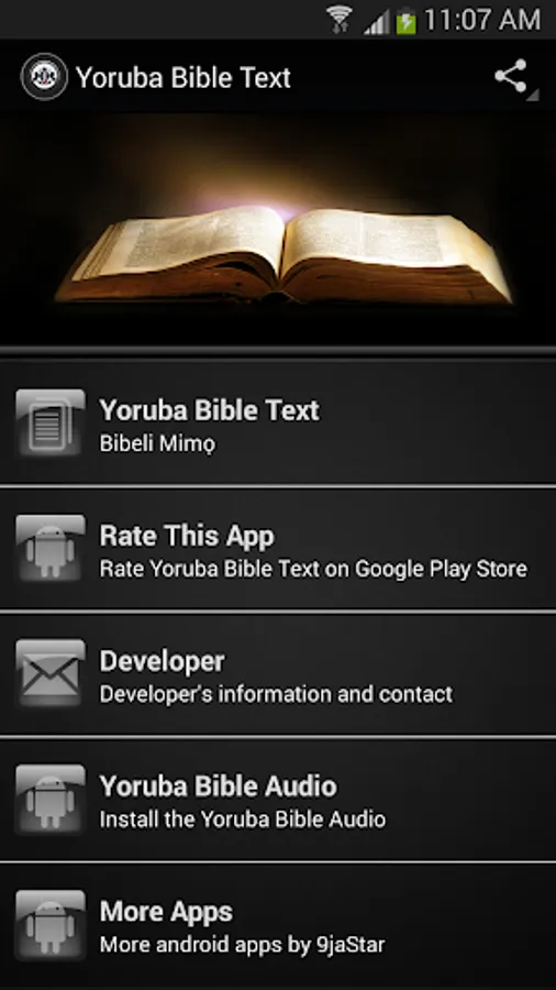 The Yoruba Bible Text is a native android application developed to enable the Yoruba speaking group in Nigeria study the Bible in their native language on their mobile device, and to spread the Gospel around the world.