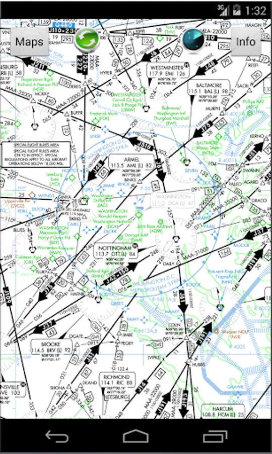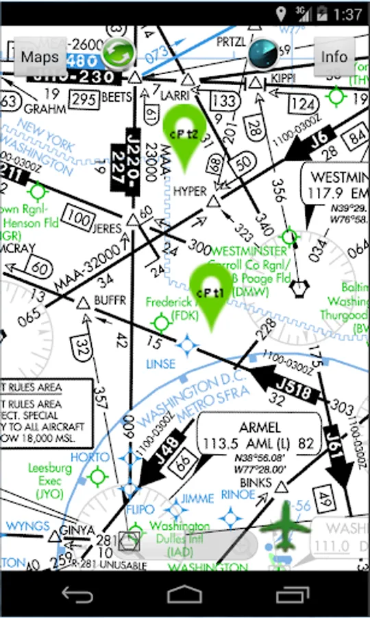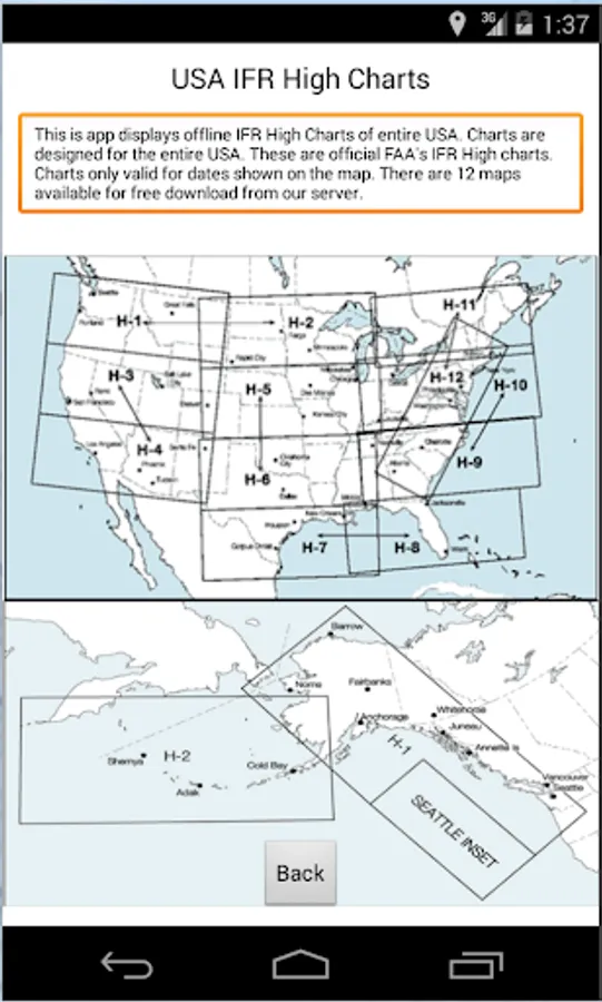 USAHighAltIFRCharts provides all offline moving High Altitude IFR Charts of entire United States. It include all 50 states including Hawaii and Alaska. This map comes preinstalled H10 Washington DC map. You can download more charts as you please free of charge. There over 12 charts that cover entire United States. You get unlimited charts database update with this app. All charts work self contained offline when you do not have any network connections (Wifi or 4G). Your current location is shown on a moving map with airplane icon centered around it.