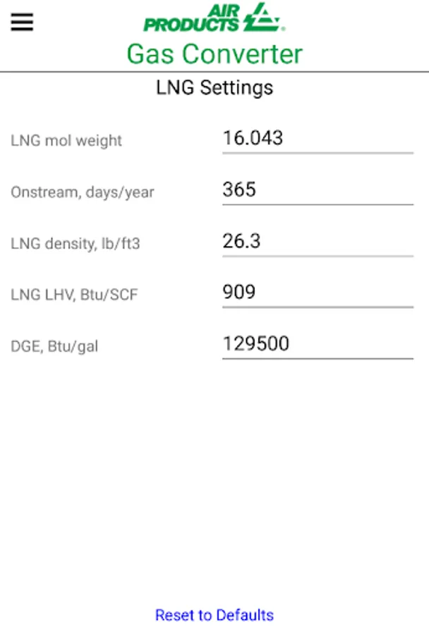To use, select an industrial gas or LNG product. Then enter the value you want to convert and select the units you want to convert from and to. Press ‘Convert.’ For LNG conversions, default settings based on pure methane are used for molecular weight, onstream days per year, LNG density, LNG low heating value, and DGE Btu/gal. You can specify your own values by pressing ‘Set Default Values.’