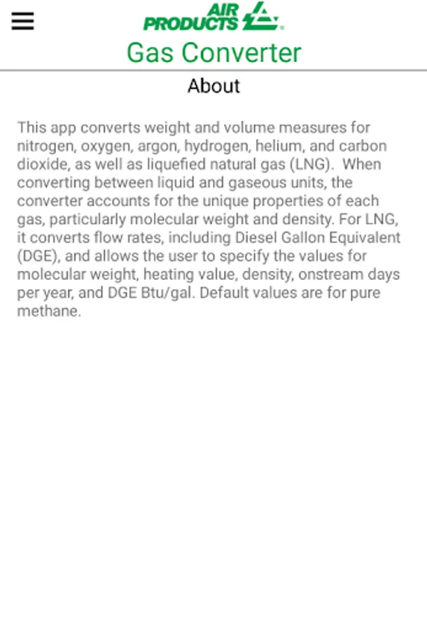 The Air Products Gas Converter converts weight and volume measures for industrial gases like nitrogen, oxygen, argon, hydrogen, helium, and carbon dioxide, as well as liquefied natural gas (LNG/methane).