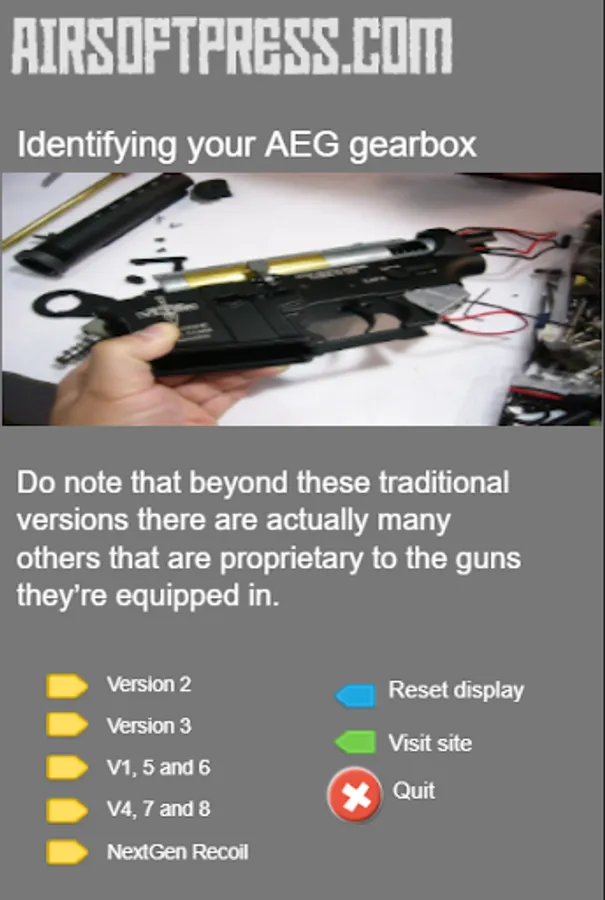 Modern airsoft gearbox is a mechanical system with gears and motor that transfer electrical into mechanical energy for firing. This app helps you find out the gearbox version of your airsoft AEG. You pick a gearbox version, and the app will produce a list of corresponding AEG models for your reference.