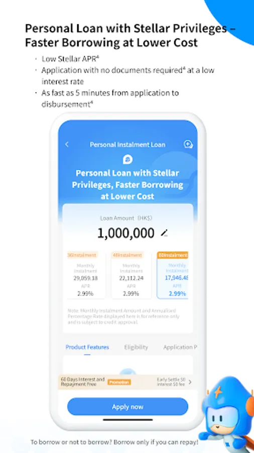 3. According to individual circumstances, the Bank reserves the right to request customers to provide additional supporting documents for approval. The approval time required is subject to real situation. Annualized Percentage Rate ("APR") is calculated in accordance with the method set out in the relevant guidelines referred to in the Code of Banking Practice and rounded up or down to the nearest two decimal places. APR is a reference rate which includes the basic interest rate and other fees and charges (if applicable) expressed as an annualized rate. The APR ranges from 1.58% to 35.81% with repayment period of 6 to 60 months. The example below is for illustrative purpose only. For a loan amount of HKD800,000 with 12 months repayment period with the APR being 1.58%, the total loan repayment amount is HKD806,819.66 (handling fee waived). Please refer to "Airstar Personal Instalment Loan Terms and Conditions" for details. This example and the resulting calculations do not constitute a quote or offer from the Bank and is not binding on the Bank. Approval of the APR is subject to the final decision of the Bank.