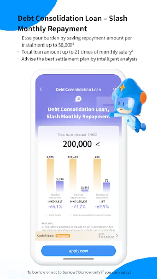 4. Interest saving example is based on an assumption that the total outstanding amount is credit card outstanding balance HKD200,000, with an annual interest rate of 30%, and monthly minimum repayment of 5% of the outstanding balance or HKD50 (whichever is higher). The APR is 34.49%. Monthly repayment amount is HKD8,952 and total interest expenses is HKD209,404. For Debt Con Loan with assumption that annual interest rate 2.95% and repayment tenor of 72 instalments, APR is 2.99%. Repayment amount per instalment is HKD3,034 and total interest expenses is HKD18,467. The average repayment amount per instalment and total interest expenses of above examples are rounded to nearest dollar. The above examples are for reference only.