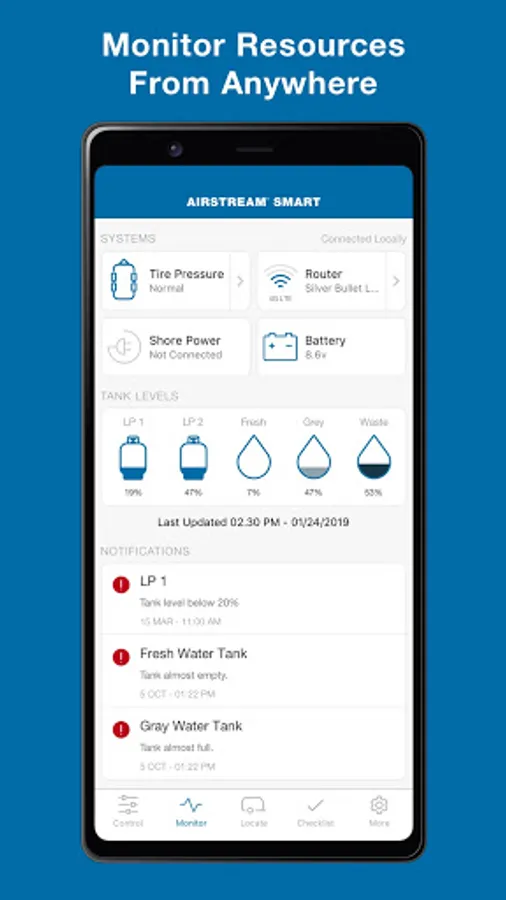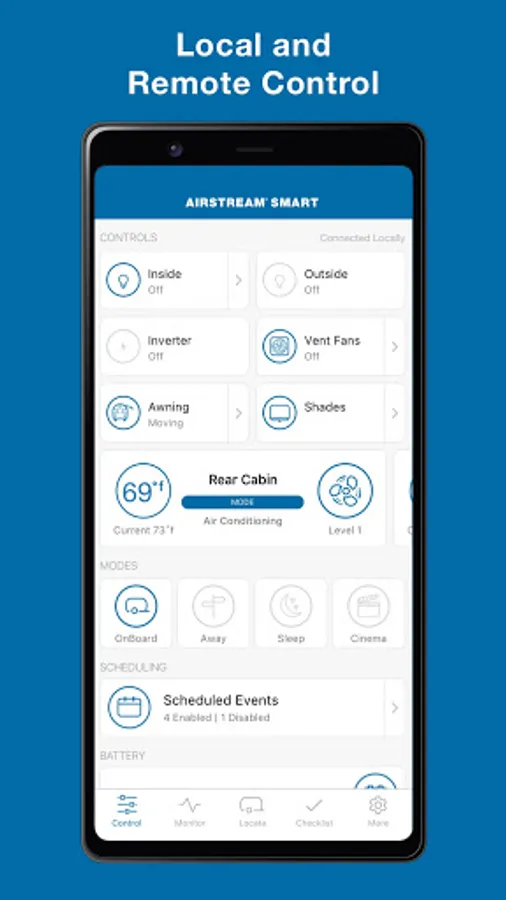 Experience the ultimate in camping freedom. Smart Control Technology from Airstream allows you to control and monitor your Airstream’s most essential features – from anywhere. Wherever your adventures take you, enjoy the comforts of home right at your fingertips.
