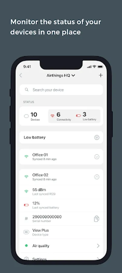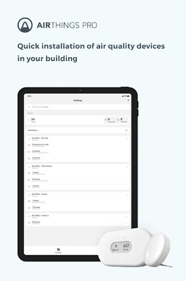 The Airthings Business app is for professional users of the Airthings for Business indoor air quality monitoring solution. It simplifies the installation and management of large-scale deployments of Space devices in offices, schools and public buildings.