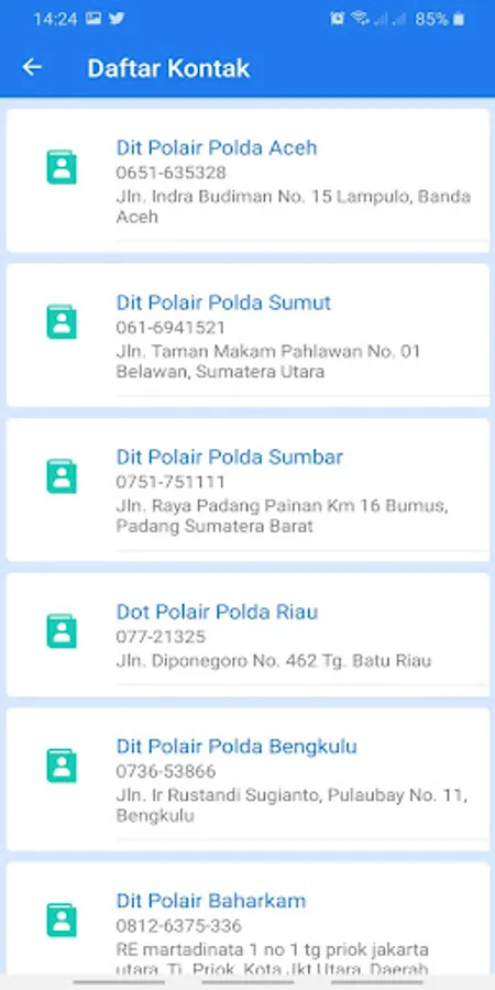- fitur Kontak yang berisikan alamat lengkap dan nomor telepon Ditpolairud Polda di seluruh wilayah Indonesia;