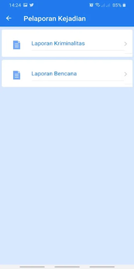 2. Laporan Bencana (untuk melaporkan adanya musibah/kecelakaan di Wilayah Periran) 3. Status (untuk mengecek progress tindak lanjut laporan yang pernah disampaikan)