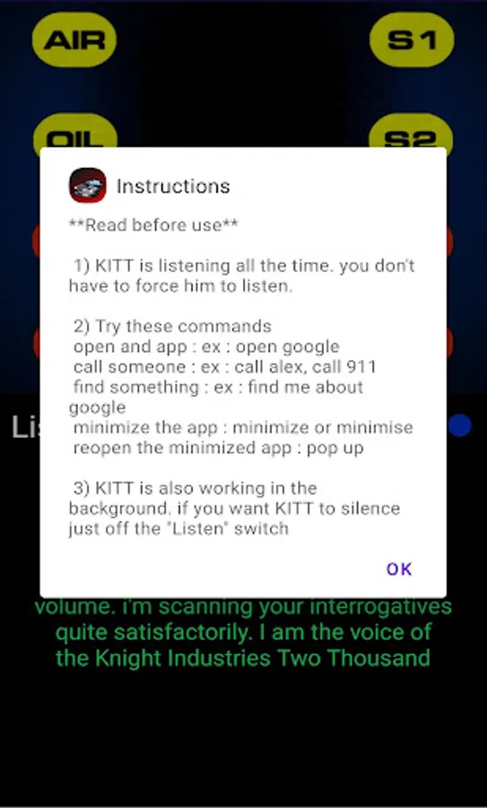 1) KITT is listening to all the time. you don't have to force him to listen.