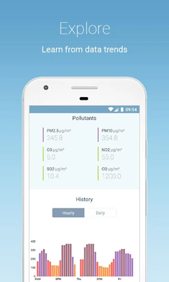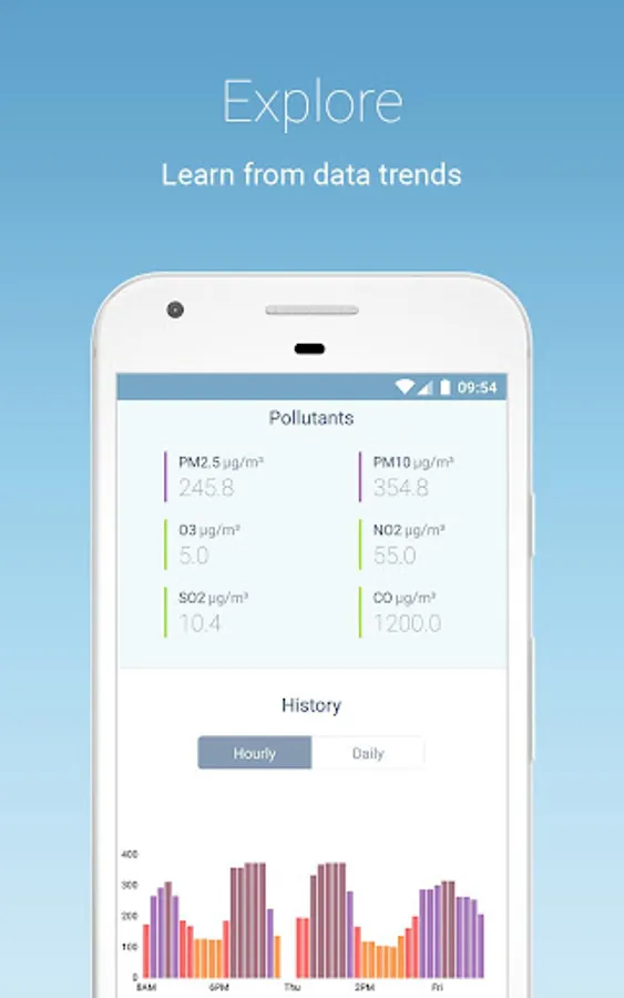 + Realtime and Historic Monitoring of 6 Key Pollutants: Track live concentrations of PM2.5, PM10, ozone, nitrogen dioxide, sulphur dioxide and carbon monoxide, and observe pollutants historical trends.