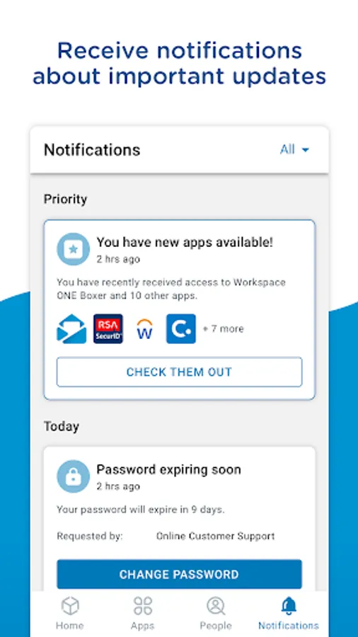 The Intelligent Hub app is the single destination where employees can have an enhanced user experience with unified onboarding, catalog, and access to services such as People, Notifications, and Home.