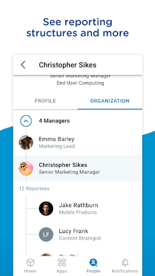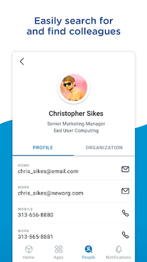 Easily search through your corporate directory by first name, last name, or email address and view employee details such as photos, titles, email addresses, phone numbers, office location and reporting structures. You can call, text, or email easily from within the app.