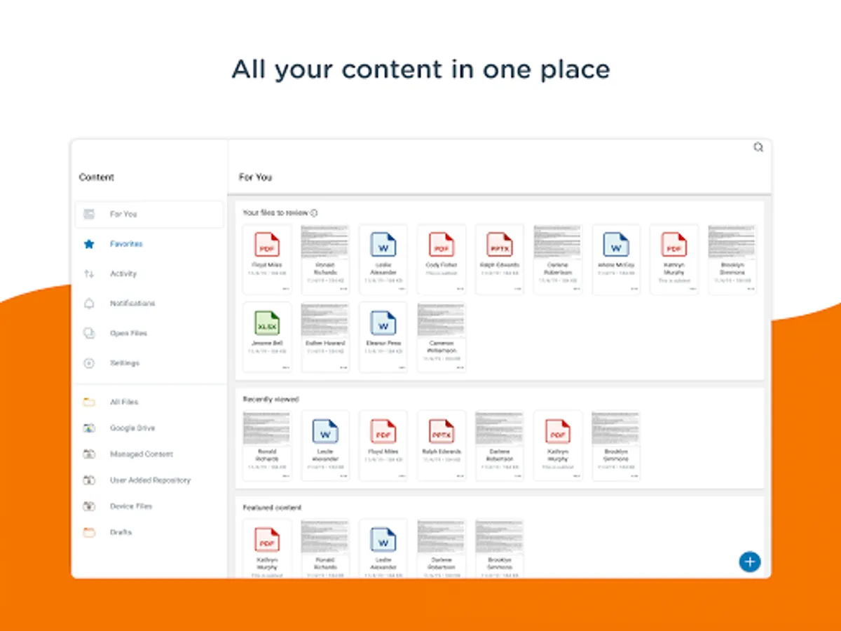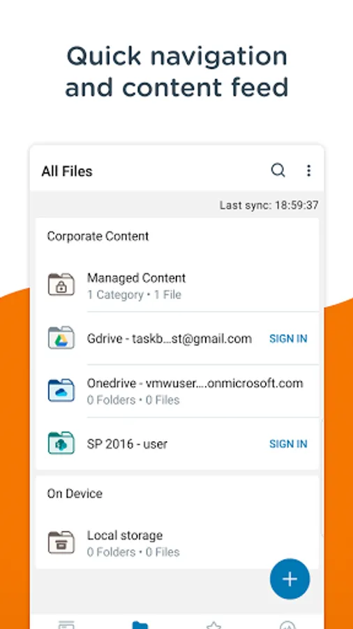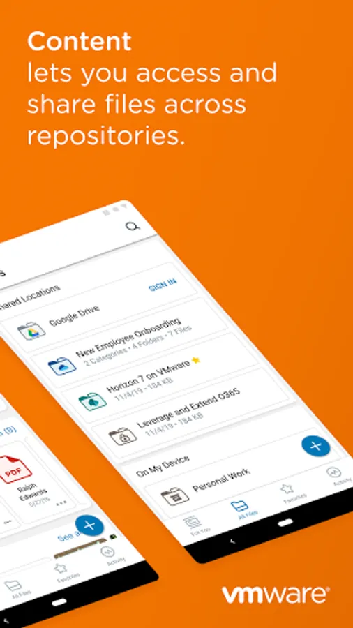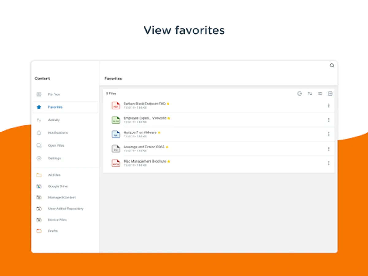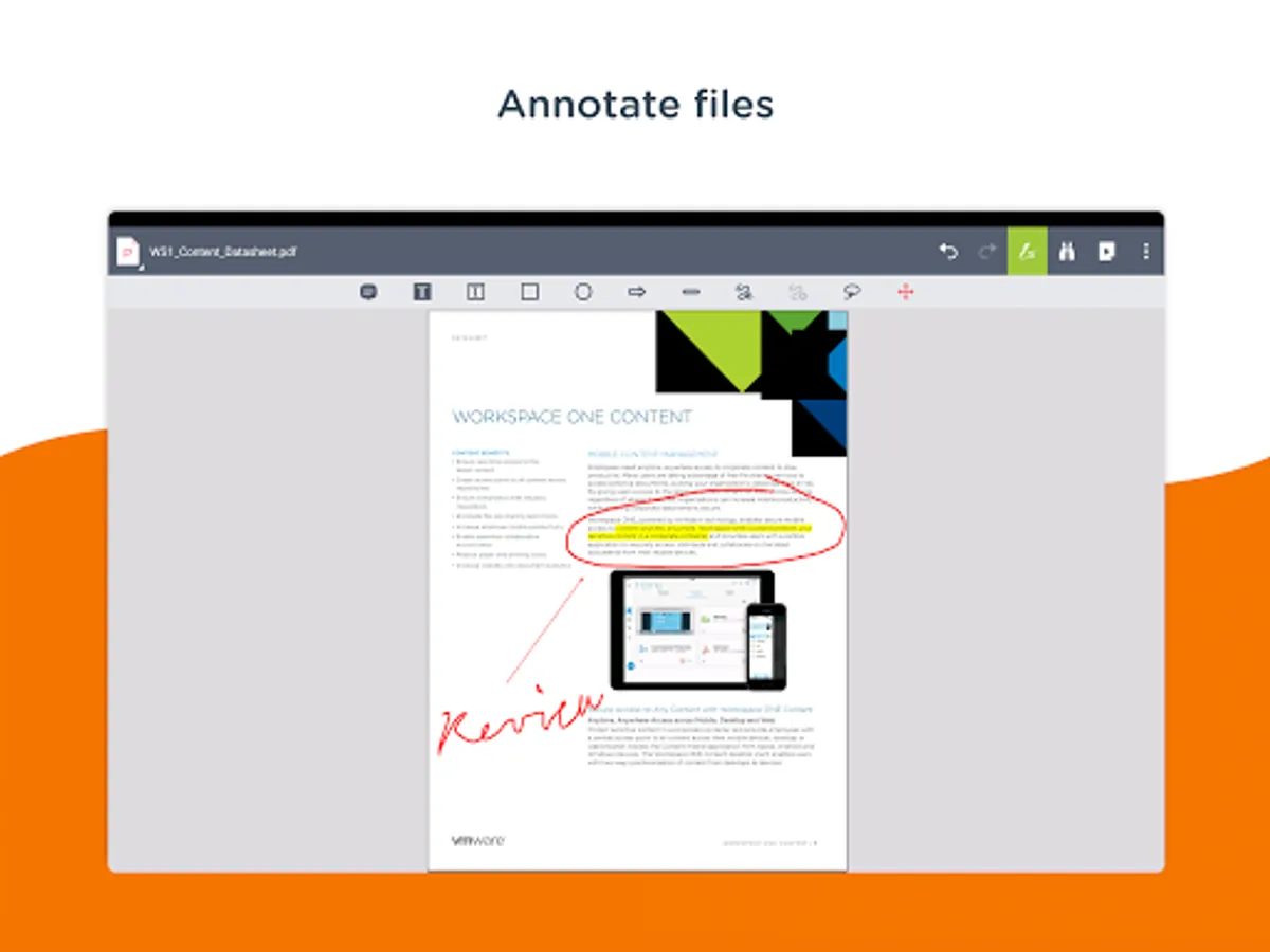 Workspace ONE Content brings you secure access to all of your files anytime, anywhere, across your devices. Easily share files, mark files as favorites, access documents offline, edit Office documents and annotate PDF files with built-in editing tools.