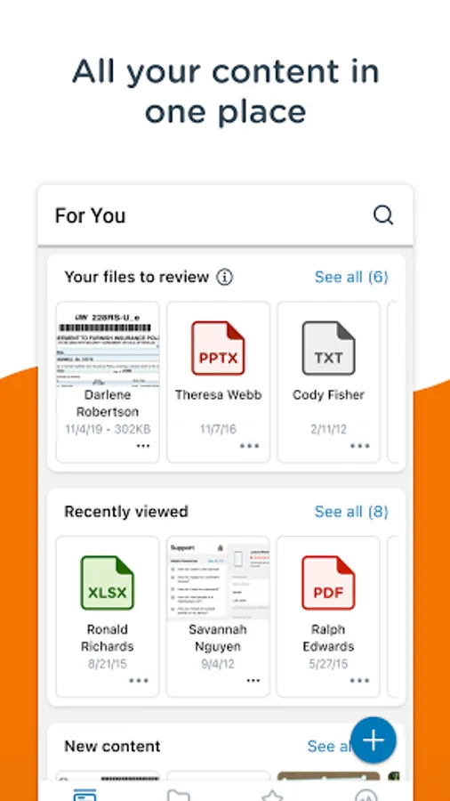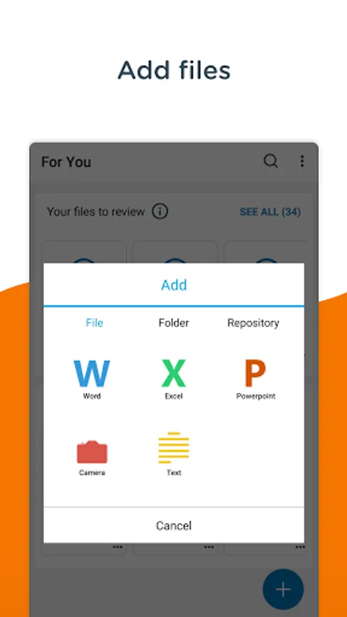 Need something new? Easily add new documents, media, folders or connect to a new repository by tapping the plus in bottom right of the app.