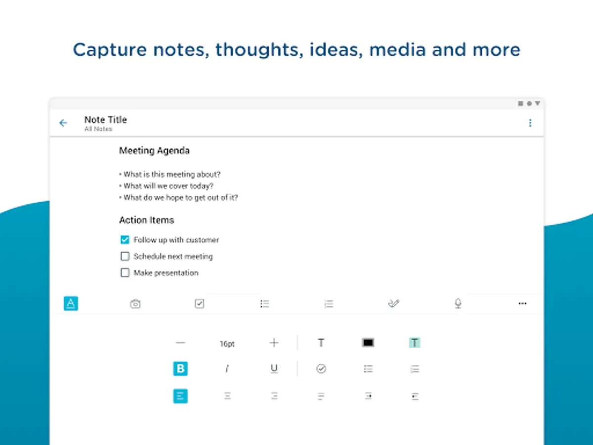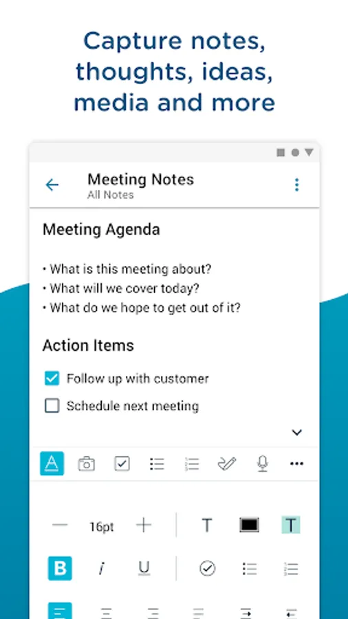Capture and organize notes, tasks, images, voice memos, handwriting and more. With business features like meeting note templates, quickly spin up a template, jot down your notes and share with the team when the meeting wraps up.
