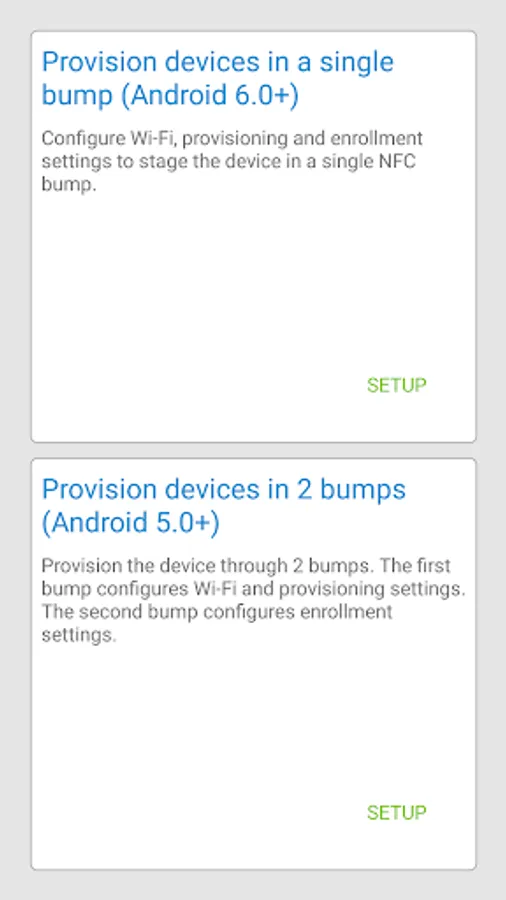 Setting up a Work Managed Device using AirWatch Relay requires a staging process. This will require a staging device or a “parent device” that will stage a “child device”. The parent device will have AirWatch Relay installed on it. This application will relay information through NFC telling the child device to: